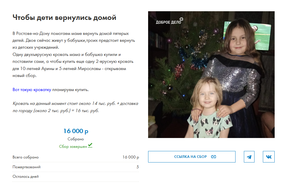 В Ростове-на-Дону помогаем маме вернуть домой пятерых детей. Двое сейчас живут у бабушки, троих предстоит вернуть из детских учреждений.Одну двухъярусную кровать мама и бабушка купили и поставили сами, а чтобы купить еще одну 2-ярусную кровать для 10-летней Арины и 5-летней Мирославы - мы открыли новый сбор.