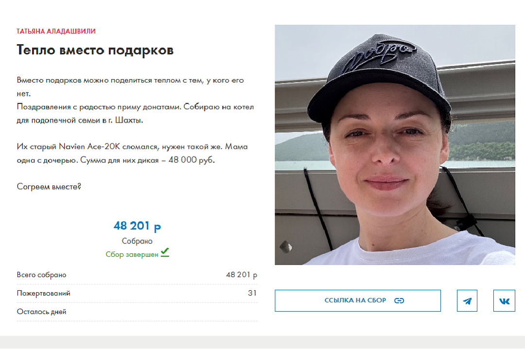 23 октября у директора «Доброго дела» Татьяны Аладашвили день рождения. Этот день нужен взрослому человеку, чтобы он опять почувствовал себя ребёнком, когда можно попросить что-то, что обязательно исполнится.Утром девочка Таня зажмурила глаза, мысленно подула на свечки на воображаемом торте и попросила исполнить мечту. Вместо подарков она попросила помочь со сбором средств для шахтинской семьи: у мамы и дочки сломался котёл – единственный источник тепла в доме.